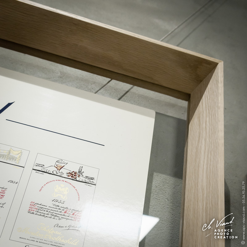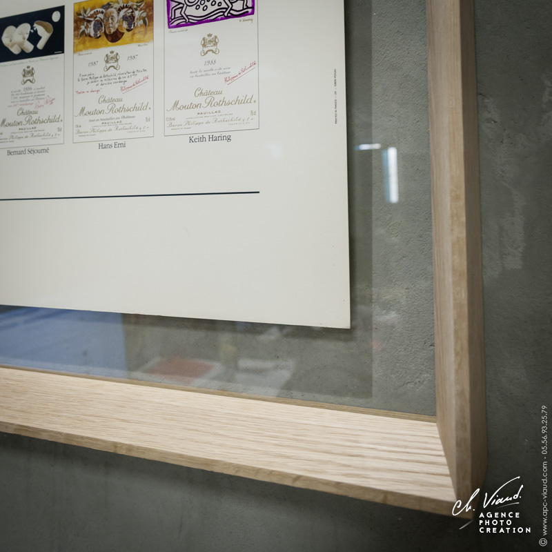 Pour habiller l'entre deux verres, c'est un cadre en chêne plein et brut que nous avons monté autour du verre, pour un aspect authentique et noble tout en restant neutre et sobre afin de laisser toute la place et l'attention que mérite l'affiche.
