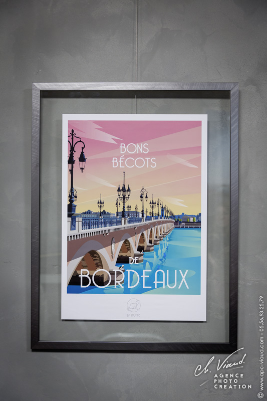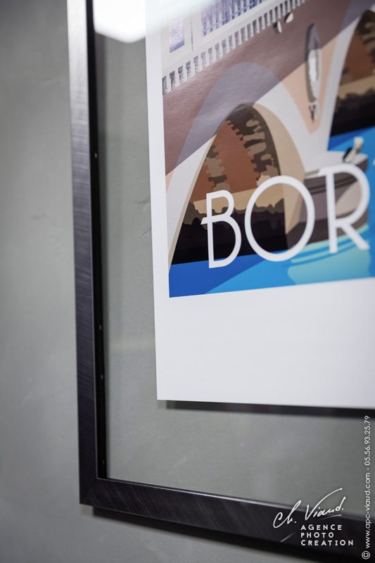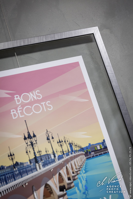 L'encadrement entre deux verres peut convenir pour tout type de document, la preuve ! Cette belle affiche de Bordeaux très colorée s'y prête parfaitement. Associée à cette baguette en bois façon alu brossé sur la face et noir mat sur la tranche, cet entre-deux verres invisible donne un encadrement exceptionnel et contemporain. Il se mariera parfaitement à son environnement, du fait de la transparence, on n'ajoute pas une couleur ou une matière supplémentaire, on donne une impression de légèreté avec l'affiche qui "flotte" dans son cadre.