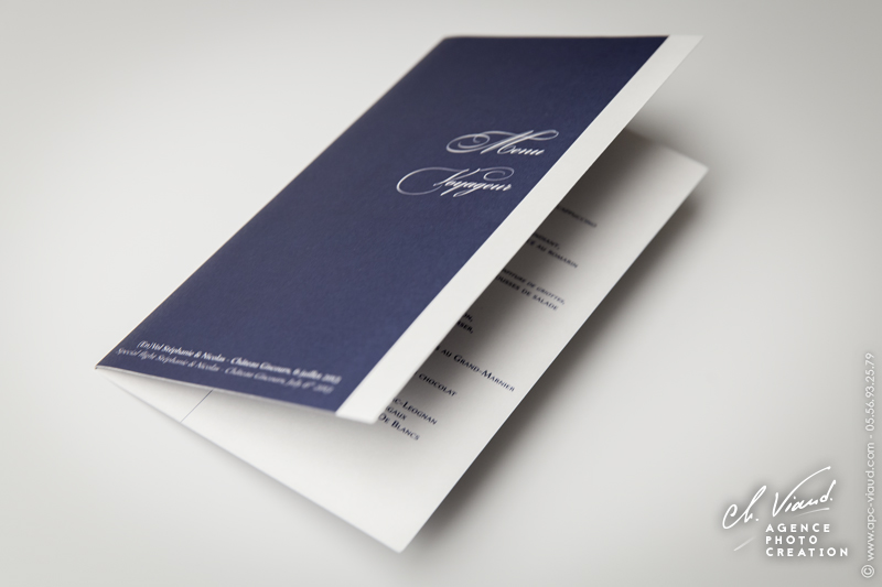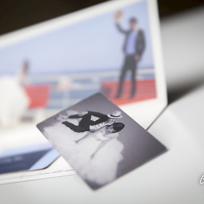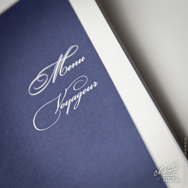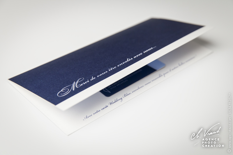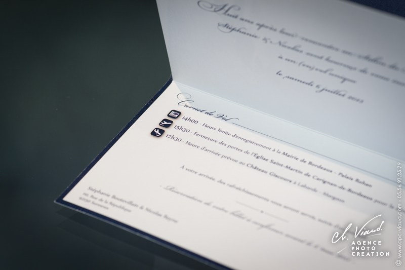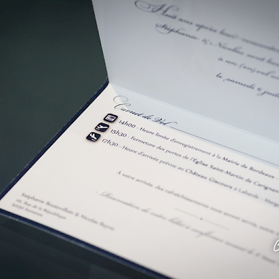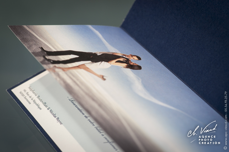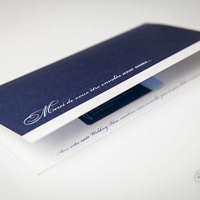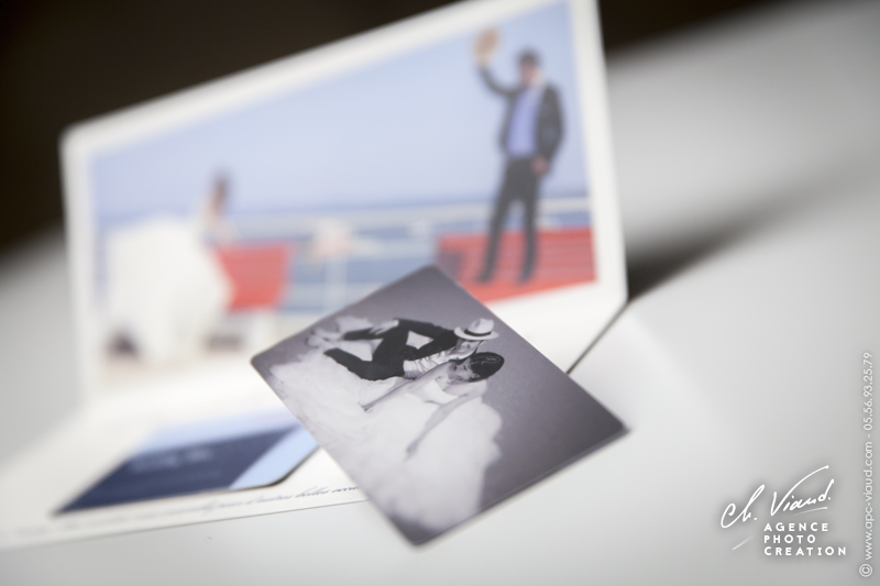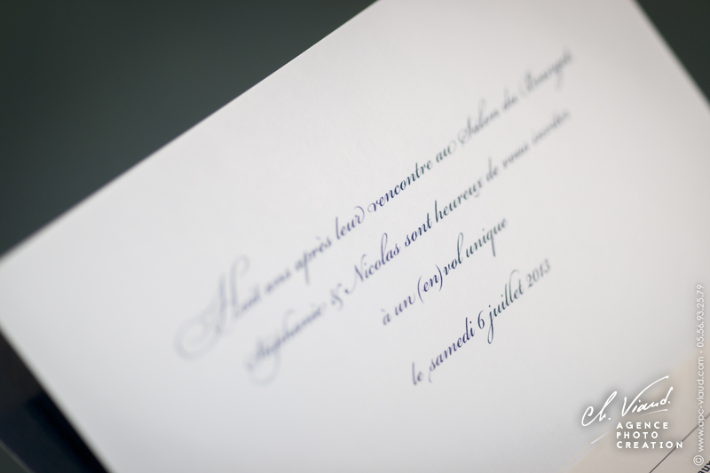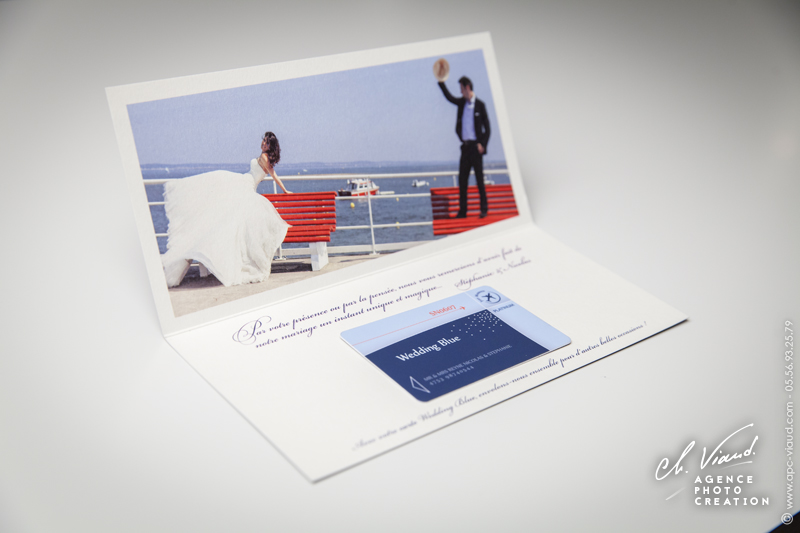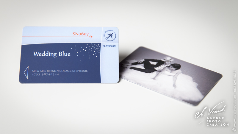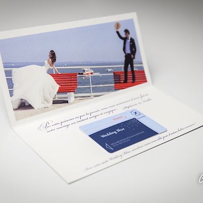 Un style très sobre et très class pour la création de ce faire-part mariage dans le thème de l'aviation, domaine qui tient à cœur à ces jeunes mariés qui se sont inspiré du style des publicités « Air France » pour qu’on réalise le visuel après notre shooting photo en studio. Un papier de création choisi sur-mesure donne un coté encore plus précieux à ces réalisations. Les menus, noms de table, et carte de remerciement illustrés et personnalisés sont déclinés dans le même esprit. Une jolie carte PVC imprimée avec une photo du jeune couple a été créée pour offrir dans la carte de remerciement aux invités présents.