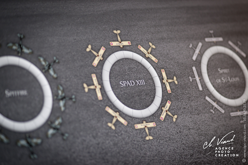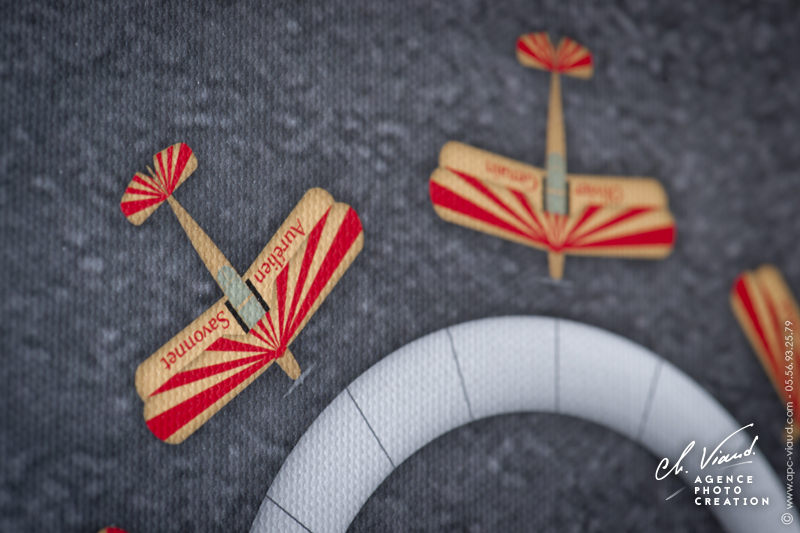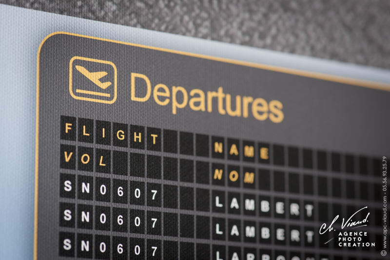 Pour rester dans le thème, nous avons réalisé pour le plan de table du mariage des illustrations sur mesure avec des avions personnalisés en fonction des tables pour indiquer l’emplacement des invités dont les noms apparaissent dans les « panneaux d’affichage d’aéroport ». Ce plan de table imprimé sur toile en format géant 120 x 120 cm dans la salle de réception a fait sensation auprès des invités présents.