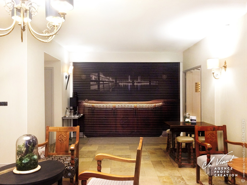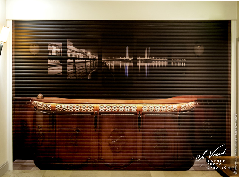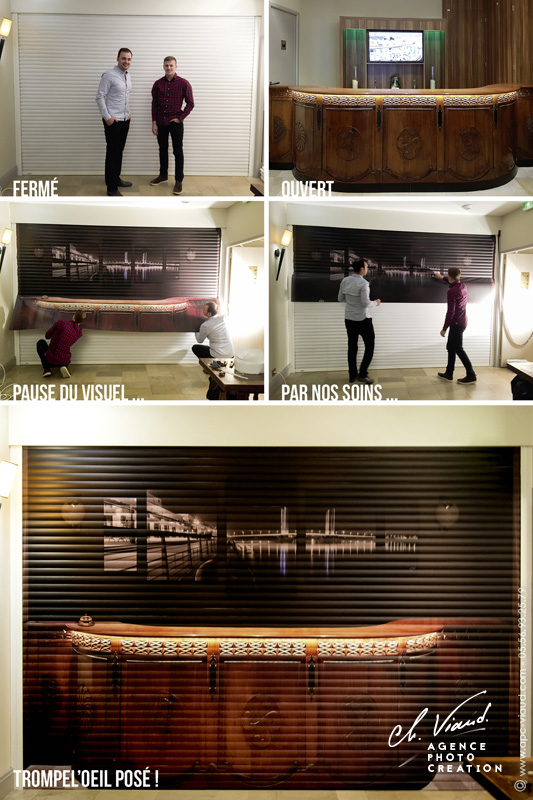 C’est ici que nous intervenons, au vu de l’environnement du volet roulant, nous avons pensé, créé, imprimé et posé un trompe l’œil en taille réelle. L’idée était de recréer l’accueil, faire comme si le volet n’existait pas et imaginer la pièce éteinte pour la nuit. Un travail de photographie, de montage photo et de graphisme a alors été nécessaire afin de concevoir le visuel du trompe l’œil. L’impression sur traceur art graphique a permis un rendu hyperréaliste qui accentue l'effet trompe l'œil. Avant la découpe et pose de l'adhésif, un pelliculage a préalablement été apposé sur le visuel de façon à le fortifier et éviter tout risque de rayures.