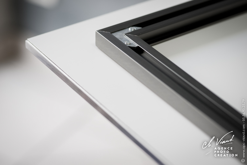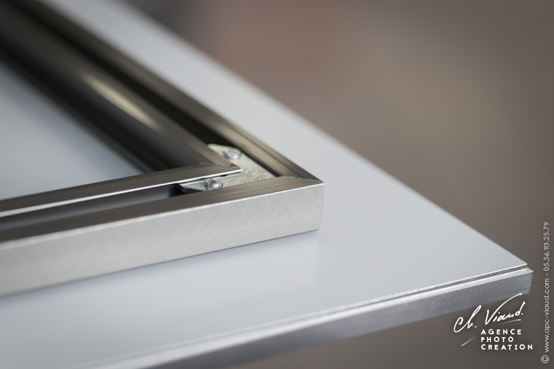 Nous avons ensuite ajouté un châssis alu de 2 cm d'épaisseur au dos qui rigidifie l'ensemble du tableau, permet le positionnement des accroches au dos et met en relief le visuel une fois accroché au mur.